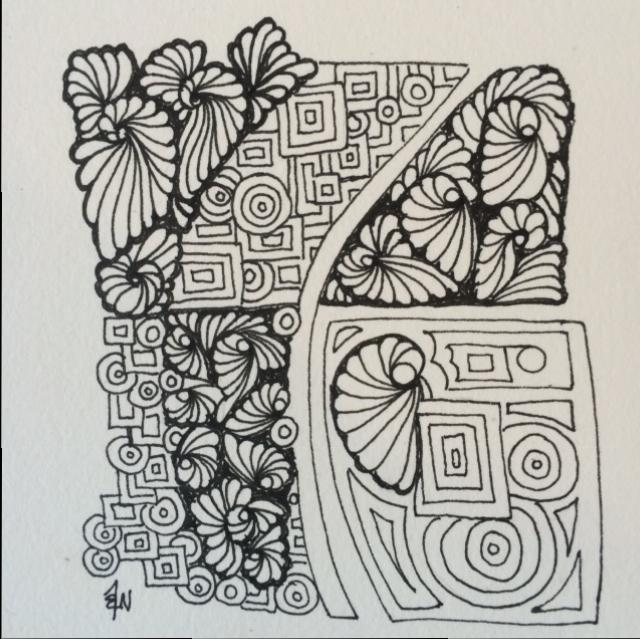 Decided to start taking up the challenges and I thought this one looked easy! Well it was interesting to use pre chosen tangles – as naturally they are not usually the favourites. I found the whole process trickier that expected. However I’m definitely coming back for more! I used additional tangles to fill in extra spaces and that probably broke the rules… This challenge can be found at It’s a String Thing #84